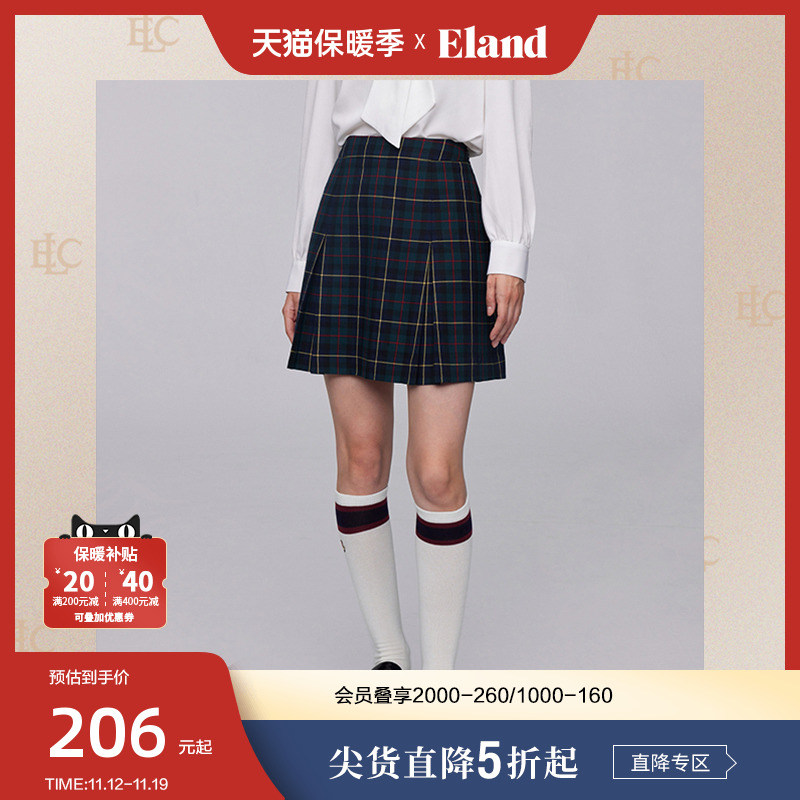 Eland衣恋百褶半身裙女秋经典简约风格纹短裙子女春秋