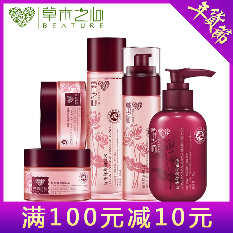 的热门产品草木之心荷花补水保湿化妆品套装女滋润紧致收缩毛孔白皙护肤品