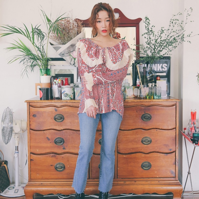 韩国stylenanda官方正品 褶裥拼接系带翻领设计印花衬衣