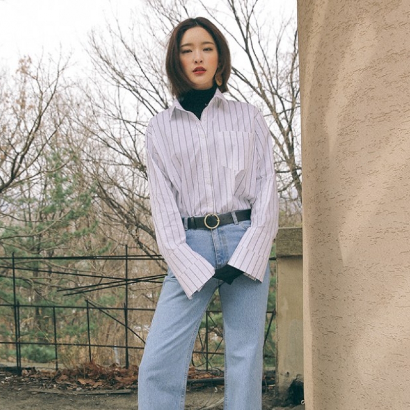 韩国stylenanda官方正品 高低摆and袖袢设计条纹衬衫