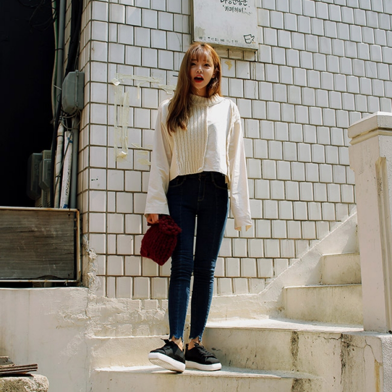 韩国stylenanda官方正品 个性针织纹理拼接T恤-米色