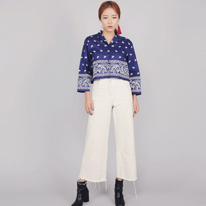 韩国stylenanda官方正品 佩斯利纹翻领短款衬衫-海军蓝色