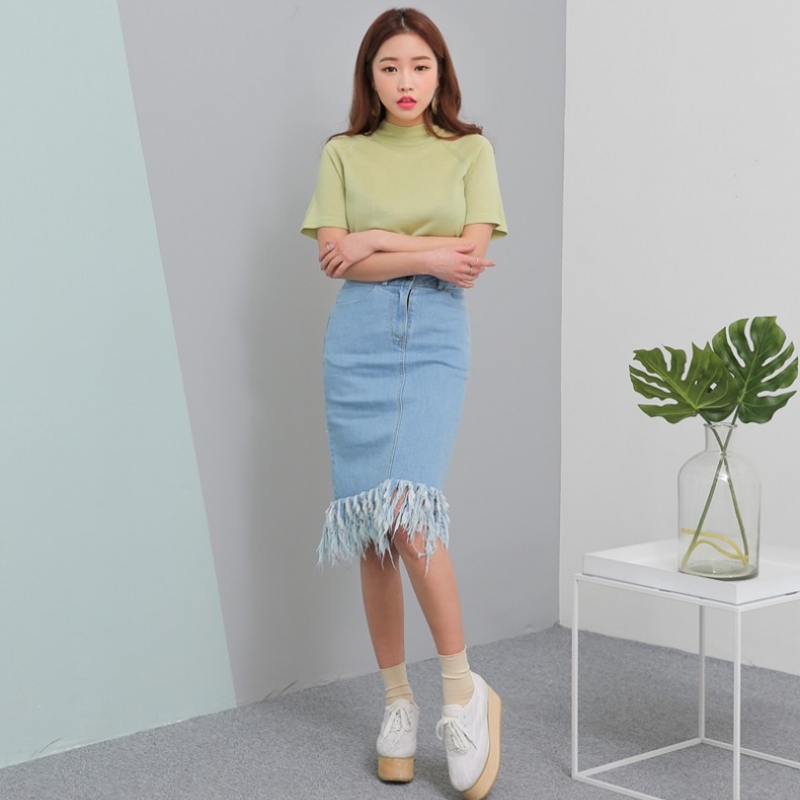 韩国stylenanda官方正品 潮流款流苏点缀牛仔半身裙-浅牛仔蓝色