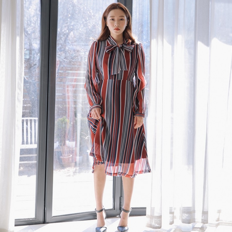 的热门产品韩国stylenanda官方正品 唯美束带领条纹连衣裙-酒红色