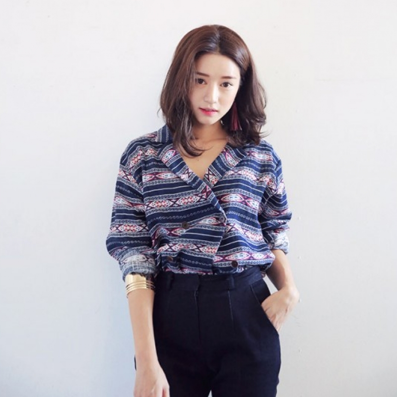 韩国stylenanda官方正品 民族风双排扣翻领衬衫-海军蓝色