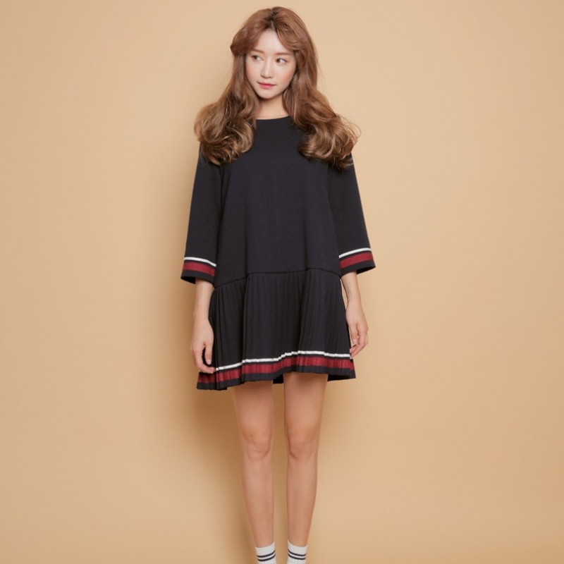 韩国stylenanda官方正品 时尚配色纤细百褶迷你连衣裙-黑色