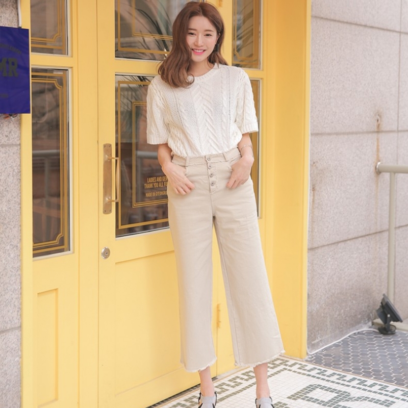 韩国stylenanda官方正品 毛边元素排扣高腰露踝阔腿裤