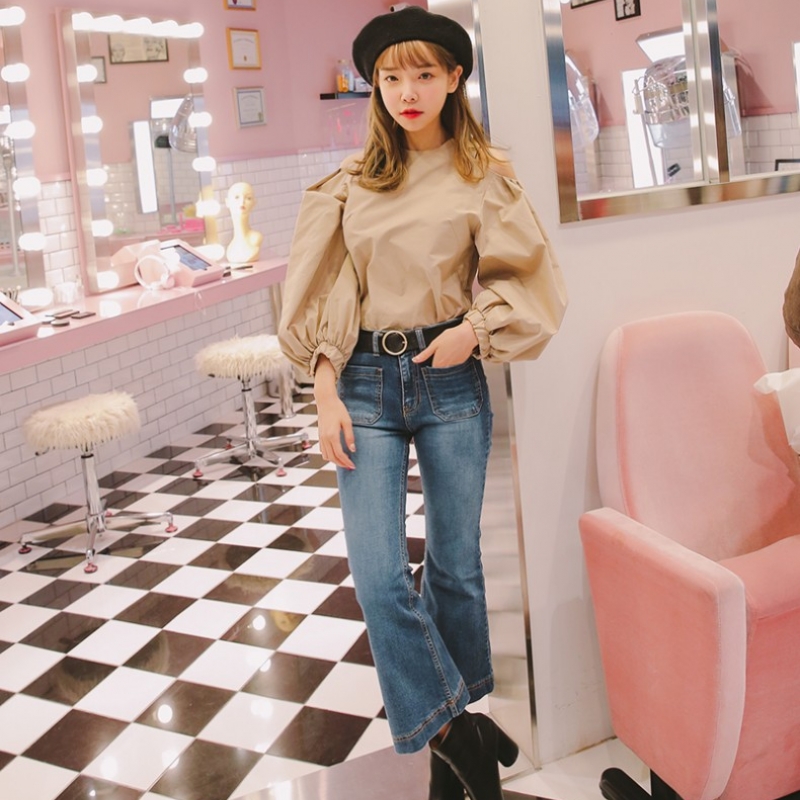 韩国stylenanda官方正品 对称方口袋九分喇叭牛仔裤-牛仔蓝色