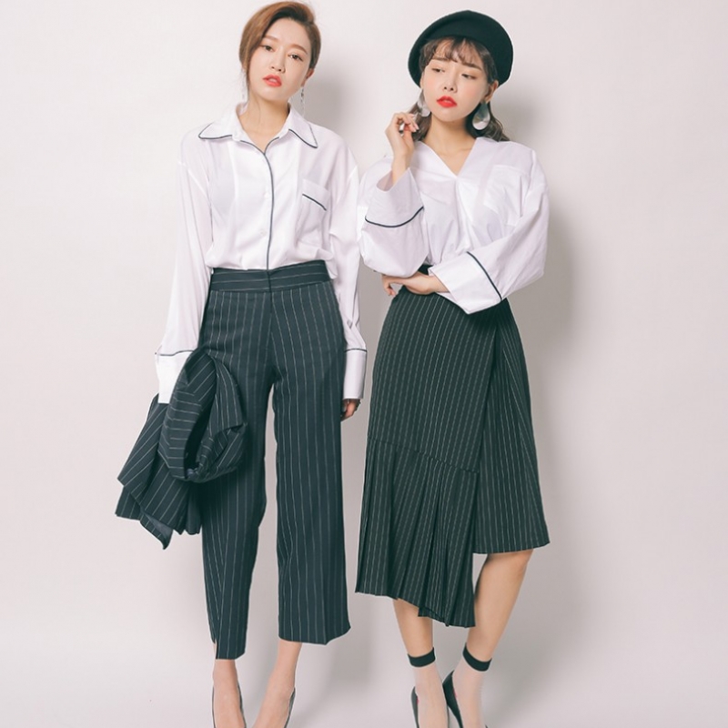 韩国stylenanda官方正品 不规则拼接百褶设计条纹裙裤