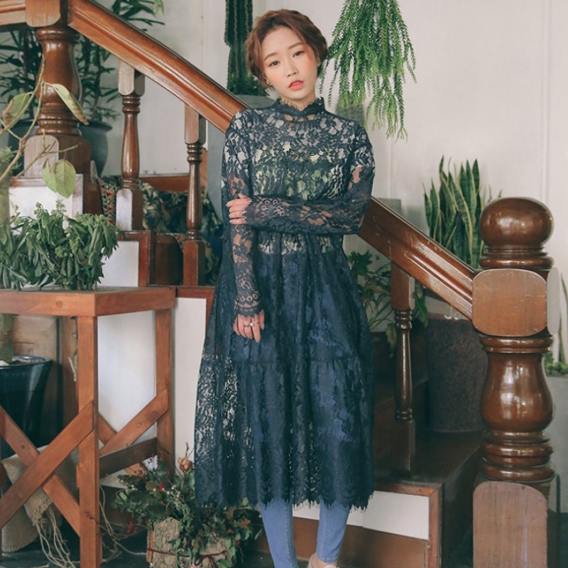 韩国stylenanda官方正品 睫毛蕾丝褶皱摆连衣裙-海军蓝色