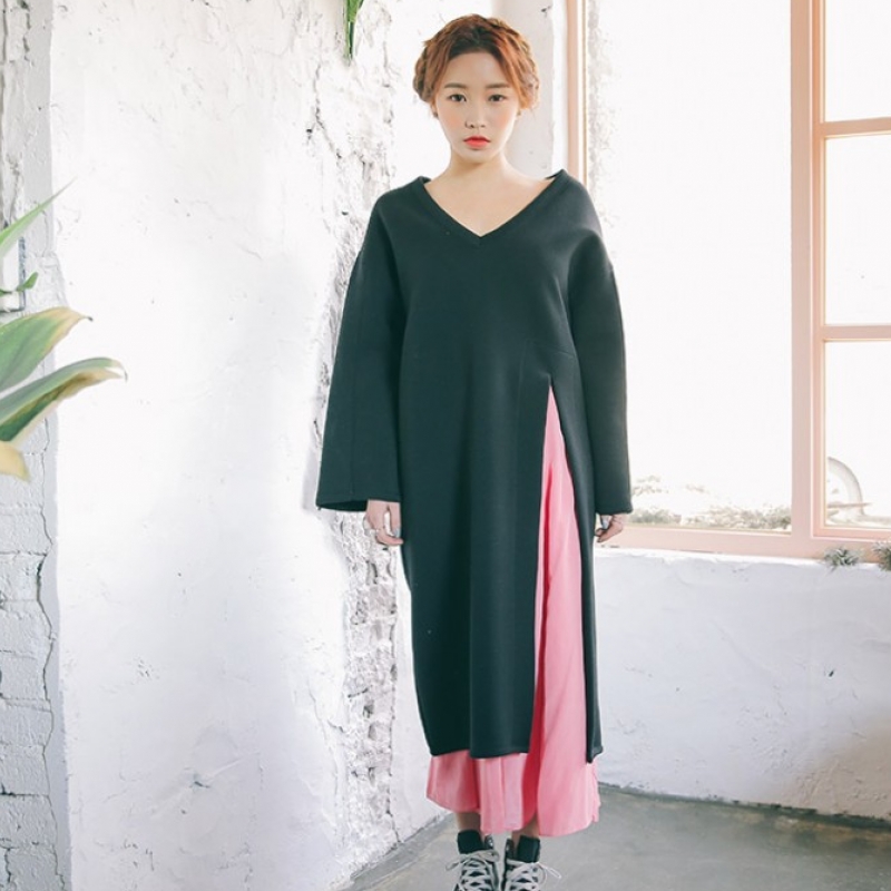 的热门产品韩国stylenanda官方正品 高开衩设计V领连衣裙-黑色