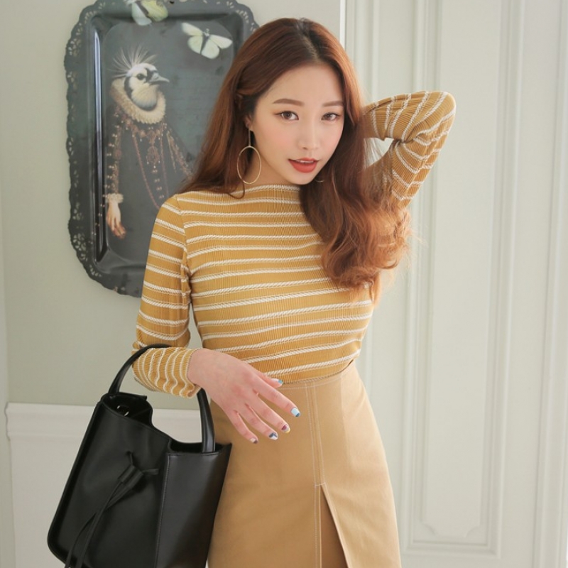 韩国stylenanda官方正品 艺术条纹一字领T恤