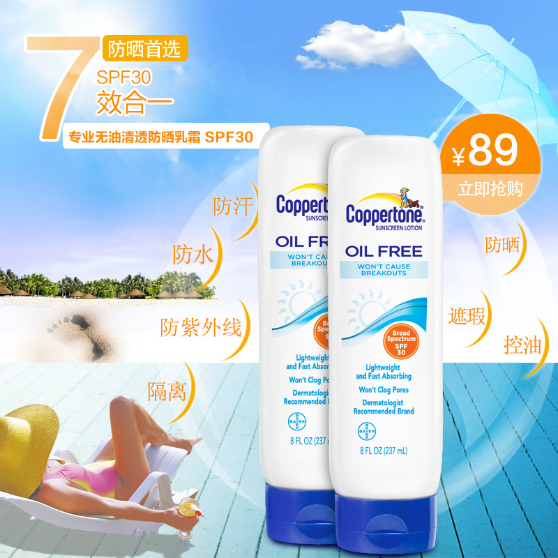 美国Coppertone/水宝宝轻透无油防晒乳237ml防水隔离防晒霜spf30