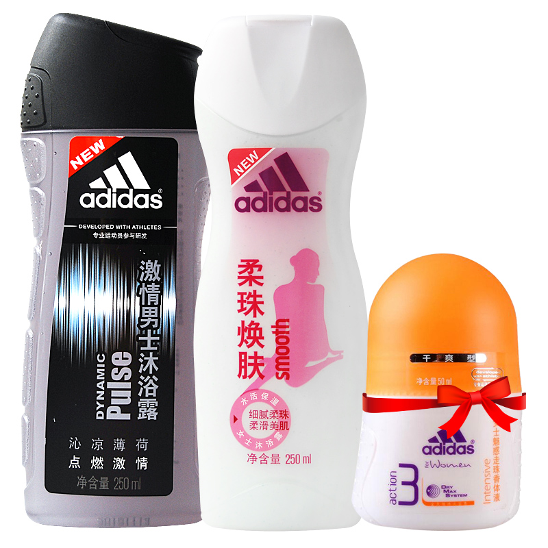 阿迪达斯激情沐浴露250ml+柔珠焕肤250ml+送女士魅惑走珠香体液