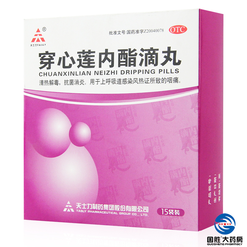 适用人群:不限 有效期:24个月 药品分类:非处方药 产品剂型:丸剂 用法:口服 类别:中药 使用剂量:口服,一次1袋,一日3次 套餐类型:套餐一.标准装 疾病:上呼吸道感染.风热感冒 品牌:TASLY/天士力 症状:咽痛 药品名称:穿心莲内酯滴丸 药品通用名:穿心莲内酯滴丸 批准文号:国药准字Z20040078 生产企业:天津天士力制药股份有限公司 规格:0.15g*15袋/盒 查看全文