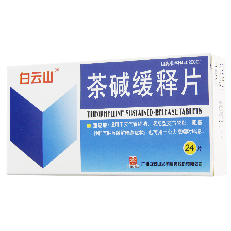 产品剂型:片剂 适用人群:不限 有效期:24个月 药品类别:化学药 用法:口服 药品分类:处方药 品牌:白云山 生产企业:广州白云山光华制药股份有限公司 疾病:支气管哮喘 症状:气促 药品规格:0.1g*24片/盒 药品名称:茶碱缓释片 药品通用名:茶碱缓释片 使用剂量:一次1~2片,一日2次。详见说明书。 批准文号:国药准字H44020002 查看全文