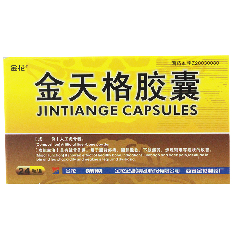 产品剂型:胶囊 适用人群:不限 有效期:24个月 用法:口服 药品类别:中药 药品分类:处方药 使用剂量:一次3粒,一日3次 疾病:骨质疏松症 品牌:金花 批准文号:国药准字Z20030080 生产企业:金花企业(集团)股份有限公司西安金花制药厂 症状:疼痛 药品名称:金天格胶囊 药品规格:0.4g*24粒/盒 药品通用名:金天格胶囊 查看全文
