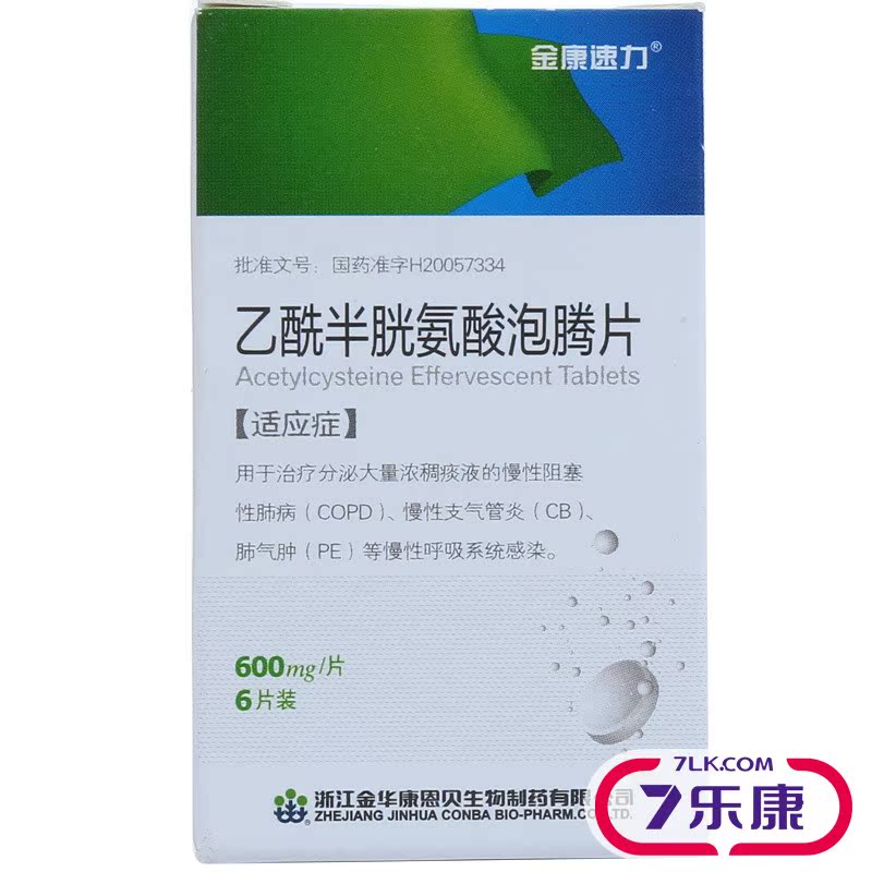 产品剂型:片剂 有效期:24个月 药品类别:化学药 用法:口服 适用人群:成人 药品分类:处方药 生产企业:浙江金华康恩贝生物制药有限公司 药品通用名:乙酰半胱氨酸泡腾片 症状:气促.胸闷 疾病:气管炎.肺气肿 使用剂量:成人:每次600mg(每次1片),每日l-2次,详见说明书 品牌:金康速力 批准文号:国药准字H20057334 药品名称:乙酰半胱氨酸泡腾片 药品规格:0.6g*6片/盒 查看全文
