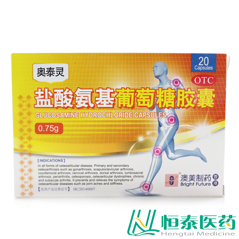 产品剂型:胶囊 药品分类:非处方药 用法:口服 适用人群:成人 有效期:36个月 类别:化学药 症状:关节红肿.肢体麻木 药品通用名:盐酸氨基葡萄糖胶囊 生产企业:香港澳美制药厂 使用剂量:一次0.75g(一次一粒),一日二次 品牌:奥泰灵 批准文号:HC20090009 疾病:关节炎.肩周炎.膝关节损伤 药品名称:奥泰灵 盐酸氨基葡萄糖胶囊 药品商品名:奥泰灵 规格:0.75g*20粒/盒 查看全文