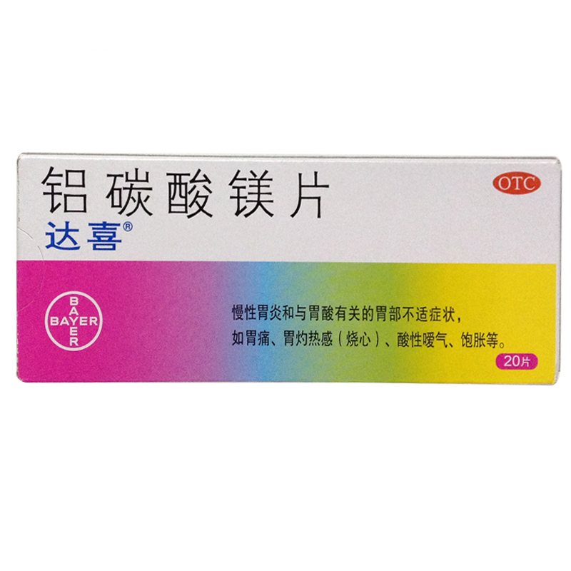 产品剂型:片剂 适用人群:不限 药品分类:非处方药 有效期:60个月 用法:口服 类别:化学药 生产企业:拜耳医药保健有限公司 使用剂量:一次1-2片,一日3次 品牌:达喜 疾病:胃酸过多 症状:胃胀.胃痛 药品名称:达喜 铝碳酸镁片 药品商品名:达喜 药品通用名:铝碳酸镁片 批准文号:国药准字H20013410 规格:0.5g*20片/盒 查看全文