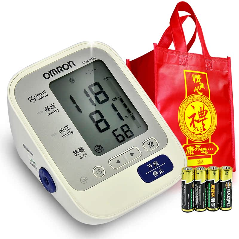 适用人群:不限 增值服务:全国联保 产地:大连 品牌:Omron/欧姆龙 疾病:高血压 症状:血压高 血压仪器种类:电子血压计 生产企业:欧姆龙(大连)有限公司 医疗器械产品名称:欧姆龙电子血压计 适用部位:上臂 执行标准号:YZB/辽1243-2014 选购热点:高低血压提示灯.体动提示.全自动.字体大.屏幕大.配AC电源 功能:袖带检测.心律测量.测量脉博.测量血压.电源适配器.高血压报警 型号:HEM-7130 注册证号:辽食药监械(准)字2014第2200223号 颜色分类:【标准套装=送适配器+送收纳袋+送原装电池】+送礼品袋.欧姆龙7130套装】+怡成JPS-5血糖仪+25片桶装试纸+送体温计+礼袋.【特惠】欧姆龙7130+原装电源+电池+收纳袋+创可贴+电子体温计 查看全文