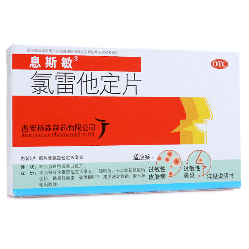 产品剂型:片剂 适用人群:不限 药品分类:非处方药 套餐类型:标准装 用法:口服 疾病:鼻炎 类别:化学药 有效期:48个月 生产企业:西安杨森制药有限公司 症状:流涕.鼻痒.鼻塞 规格:10mg*6片/盒 使用剂量:一次1片,一日1次 品牌:息斯敏 药品名称:氯雷他定片 药品商品名:息斯敏 药品通用名:氯雷他定片 批准文号:国药准字H20070030 查看全文