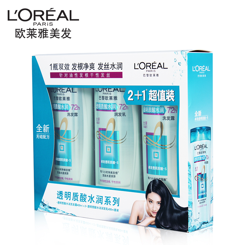 欧莱雅洗发水套装 透明质酸洗发水400ml润发乳200ml 无硅去油水润